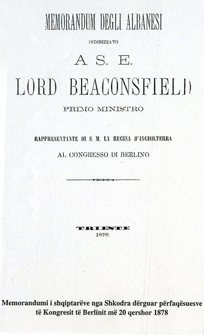 [Memorandum degli Albanesi indirizzato a S. E. Lord Beaconsfield, Primo Ministro, rappresentante di S. M. La Regina d’Inghilterra al Congresso di Berlino (Trieste 1878), 19 pp. Translated from the Italian by Robert Elsie.]